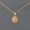 Drei unregelmäßige Gold-Scheiben werden aufeinander gelötet. Dadurch entsteht in der Draufsicht eine lebhafte runde Fläche. Ein funkelnder Brillant wird von einer matten Gold Oberfläche gehalten.