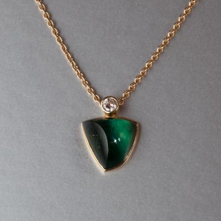 Glücklich schätzt sich, wer diesen einzigartigen Anhänger mit einem großen, grünen Turmalin als Halsschmuck tragen darf. Dieser außergewöhnliche Turmalin besticht durch seinen besonderen Schliff. In dem, in Gold gefassten, ausgefallenen Edelstein-Anhänger verbindet sich die Klarheit des Diamanten mit der Tiefgründigkeit des Turmalins zu einer harmonischen Einheit.